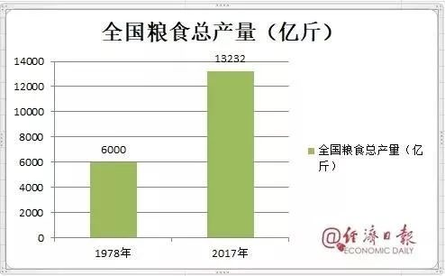 1978年全国粮食总产量仅有6000多亿斤,2017年全国粮食总产量增至13232亿斤。谱写了人类反贫困史上的辉煌篇章。近年来,我国谷物、肉类、花生、茶叶产量稳居世界第一位。