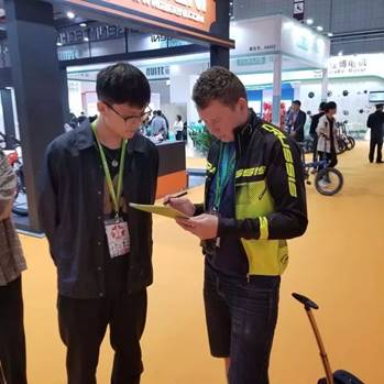 5月6日上午,在展会布置完成后正式进入展览阶段。本次展会规模盛大,汇集了来自各地的参展商和参观者,每一家公司都有自己的品牌特色。各种自行车行业前沿的可见水平与产品缤纷呈现,琳琅满目。经过宝归来公司杨总的短暂培训后,五名外语系学生带着事先准备好的问卷开始进行市场调查。展会的参观客户虽然大多来自国外,但外语系学生经过培训,已经熟练掌握了产品知识和术语并能用流利而自信的口语与前来参观的客户进行沟通与洽谈。