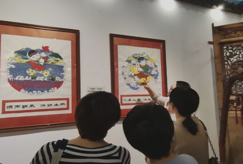 在黄馆长的带领下,我们走进了金华木版年画展示基地。白墙青瓦,雕梁画栋,尽显雅素明净,古色古香。黄馆长介绍道:“作为非物质文化遗产的木版年画,形成于宋元,鼎盛于明清,在此收藏着许多作品,例如五子登科、供水娃娃、防洪娃娃、连年有余......”金华是享誉全国的年画产地之一,金华木版年画填补了浙江木版年画艺术的空白,具有悠久的历史。