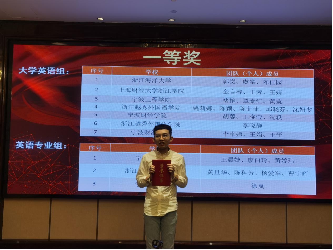 9月30日,“浙江省外语课程思政优秀教学案例交流与征集活动”省级决赛在浙江省杭州市举行,外语系教师金言睿、王芳、王婧代表学院参赛,并荣获省赛一等奖。