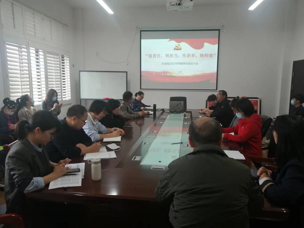 为进一步推进师德师风建设工作,提高教师的思想政治素质和职业道德修养,建设一支师德高尚、业务能力强的教师队伍,10月28日中午,外语系在29幢217会议室召开“强责任,明担当,作表率,铸师魂”师德师风建设会议。大会由外语系党总支副书记王明照主持,外语系副主任徐玉书以及全体教师参加了会议。
