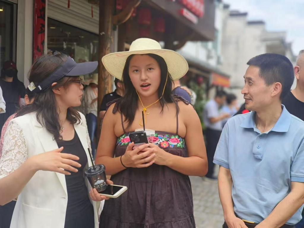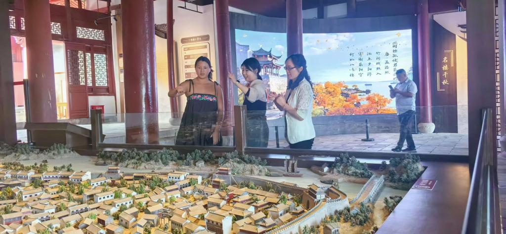 在坡阳古街,曹老师陪同袁女士沉浸式体验国家级非遗项目婺剧,深入介绍其源远流长的历史渊源与表演艺术特色。随后,在万佛塔、金华市博物馆、八咏楼等历史文化地标中,曹老师与讲解员共同进行中英文讲解,精准转译地方文化意象,将金华古城的历史风貌与人文情怀清晰地传达给中外听众。这种翻译,不仅完成了语言的转换,更通过文化的二度诠释,赋予地方文化以世界语境中的生命力。
