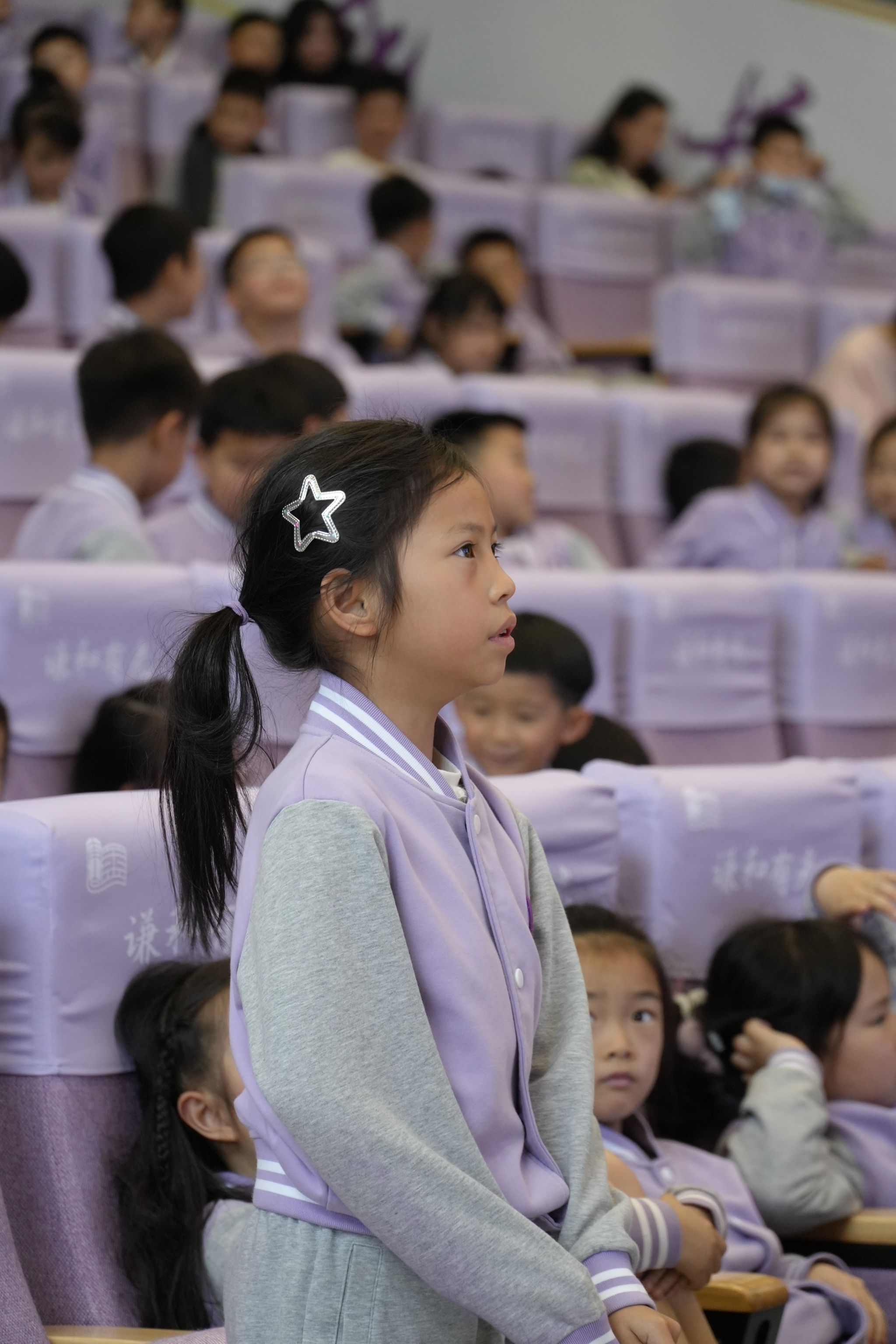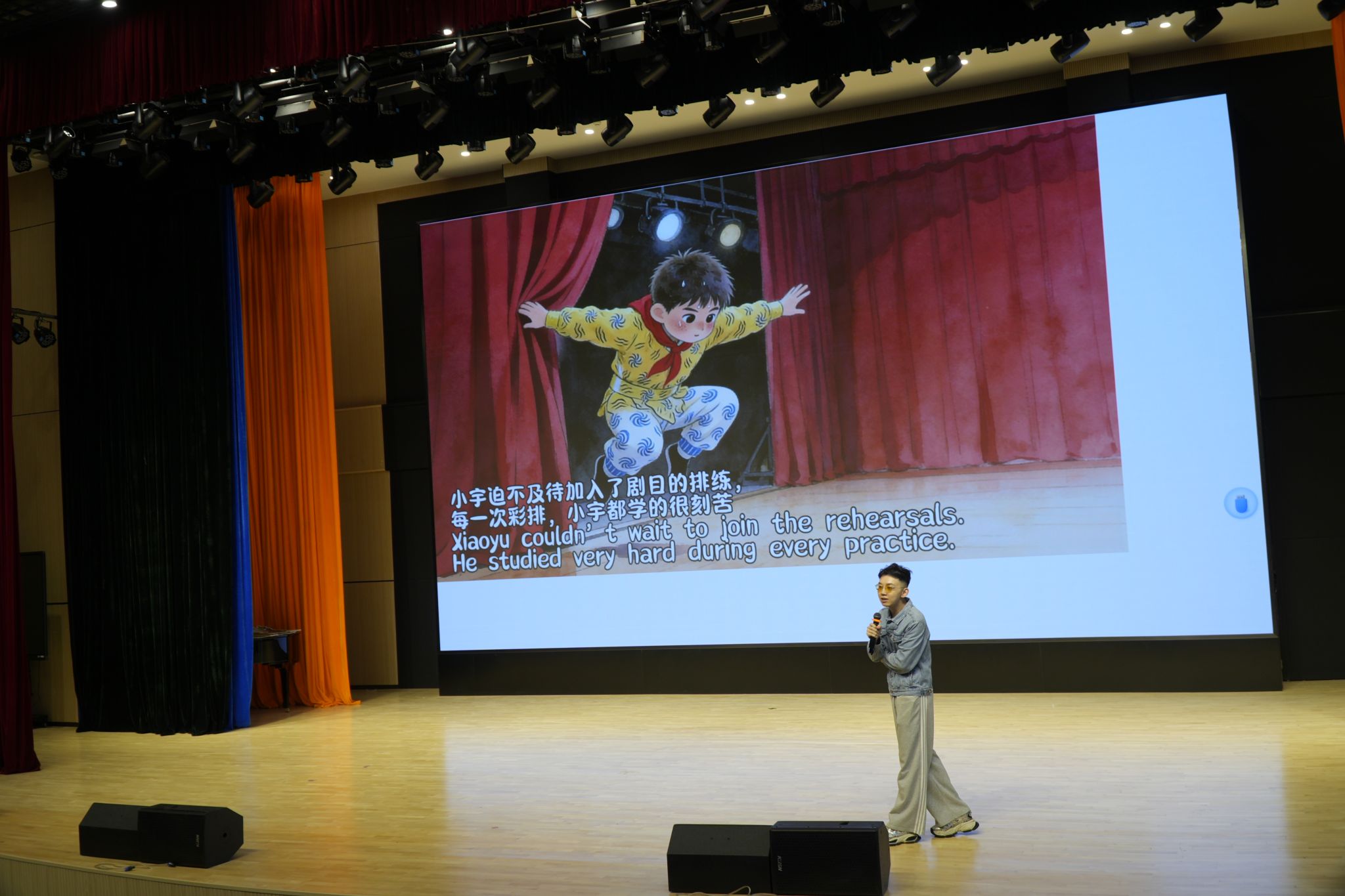 随后,我院金言睿老师带来了一堂充满童趣的“婺剧双语小课堂”。他向同学们展示了我院学生自编自创的双语绘本《小不点,大婺星》。绘本讲述了小学生小宇与婺剧之间一段奇妙的缘分——从最初对脸谱的好奇,到走进剧场、理解角色,最终在心中种下热爱传统文化的种子。金老师以中英双语讲述绘本故事,并引导孩子们尝试用英语表达剧中角色的情绪与特质,现场互动热烈,孩子们踊跃发言,课堂气氛轻松活跃。
