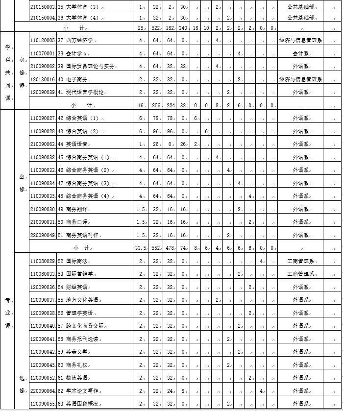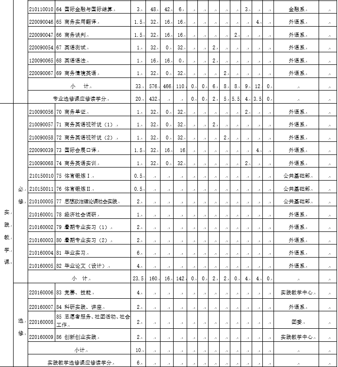 以党的教育方针为指导,遵循教育规律,从学校和本专业的实际出发,充分体现“教育要面向现代化,面向世界,面向未来”的时代精神。努力吸收近几年来,特别是“高等教育面向21世纪教学内容和课程体系改革计划”实施以来教学改革与教学研究的最新成果,以人的发展为核心构建课程体系,优选教学内容和优化教学方法,努力培养宽口径、厚基础、高素质、善创新的应用型、复合型、外向型、创新型的高级商务英语人才。