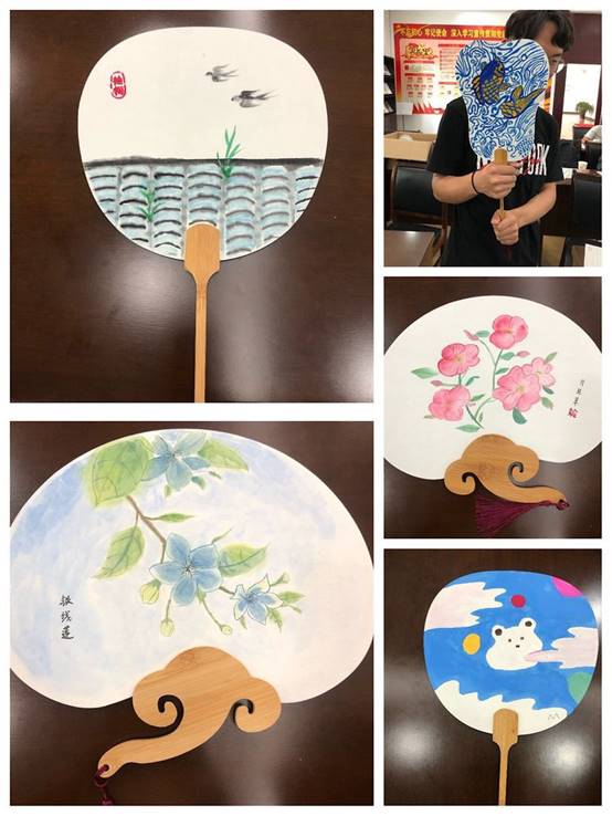 团扇又称宫扇、纨扇。中国传统工艺品及艺术品。是一种圆形有柄的扇子。团扇起源于中国,古代团扇的形状各种各样,完全根据自己的喜欢设计样式形状,但是还是有比较流行的主题样式的。此次团扇选用了千鸟扇、祥云扇、苹果扇、美人扇和芭蕉扇。同学们各自选择了自己喜好的扇形,画出心中最美的团扇。