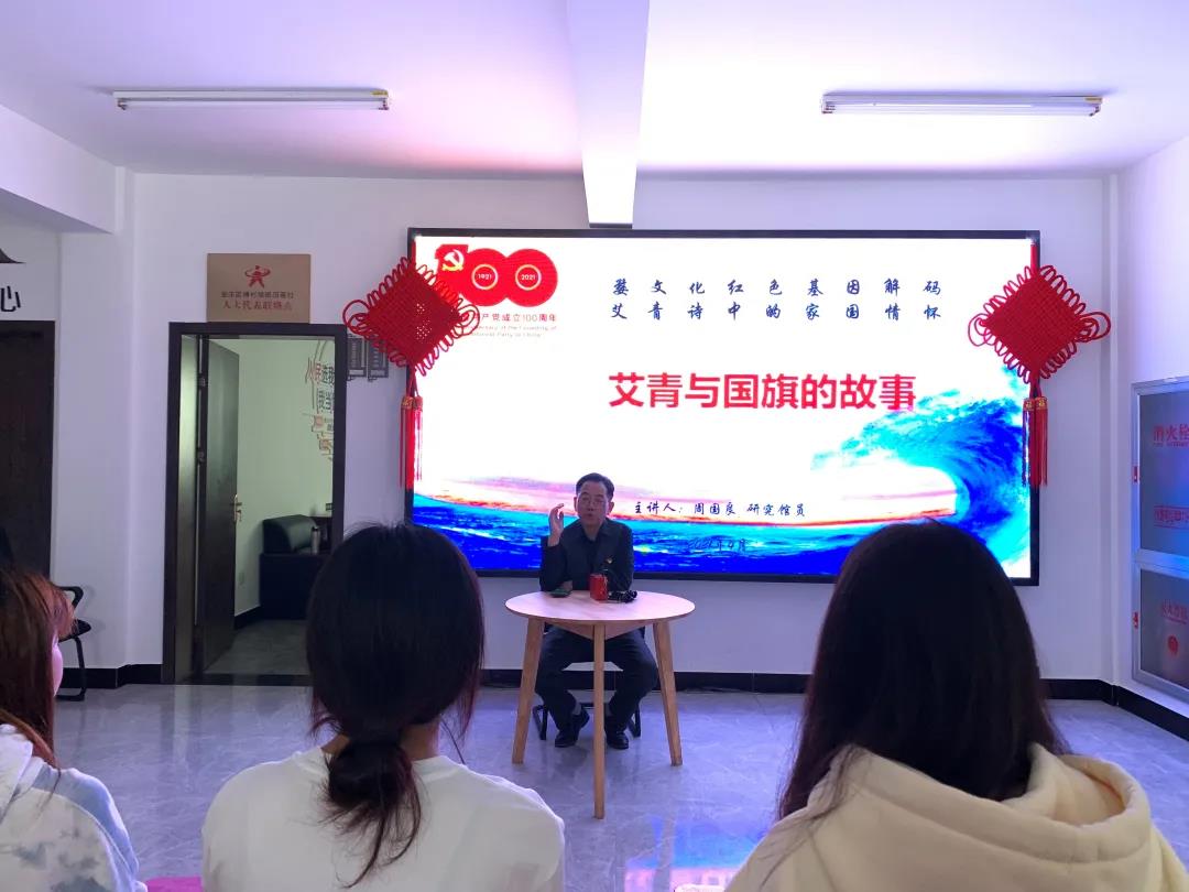 两个支部的党员、入党积极分子一同到达位于金华市傅村镇畈田蒋村的艾青故居,现场集体朗读了《大堰河—我的保姆》、中英双语《我爱这土地》,通过实地“走读”,重温红色历史,感悟革命初心。随后,艾青纪念馆党支部书记周国良在村党员活动室给大家带来了一场《艾青与国旗的故事》的“婺文化基因解码”党史交流课,聚焦艾青生平,讲述了艾青与中华人民共和国国旗的故事,对艾青的文艺才华、爱国情怀进行了全方位解读,其独特的视角,新颖的分析,不时博得在场人员的热烈掌声。