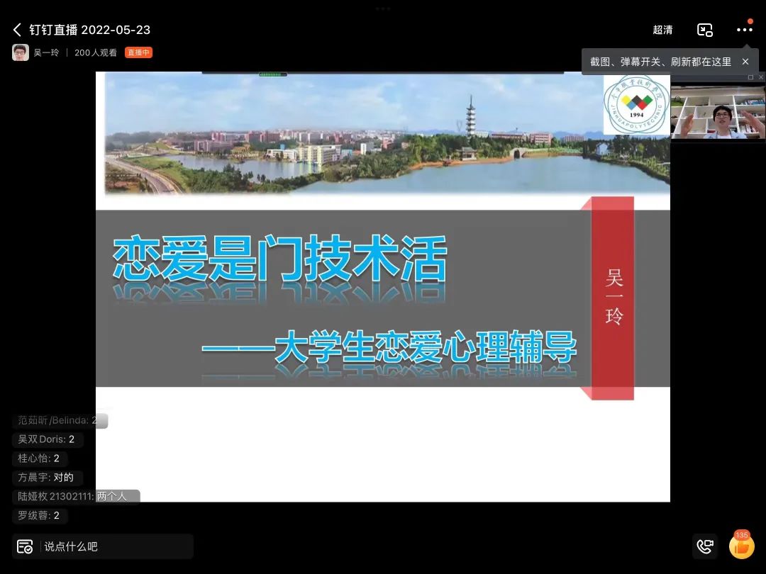 吴一玲,金华职业技术学院心理中心主任、副教授,首届浙江省高校心理教师年度人物。2022年5月23日,我系有幸邀请到了吴一玲老师,为同学们举办了以“恋爱是门技术活”为主题的线上心理讲座。