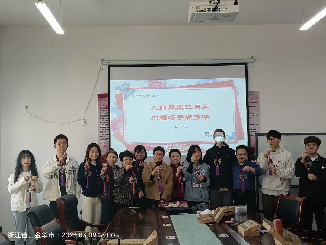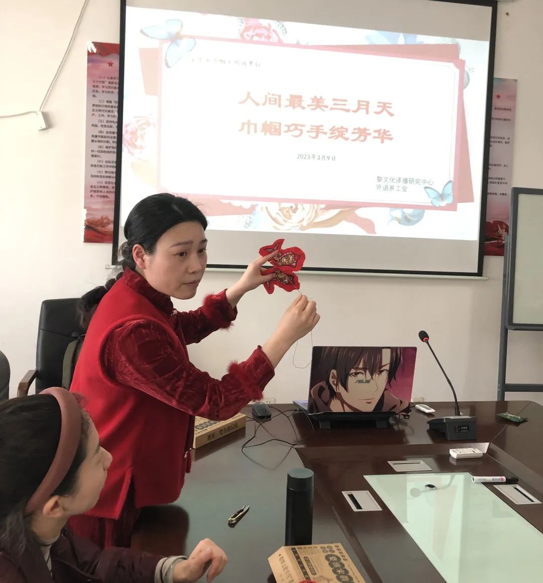 为迎接第113个国际妇女节,我院婺文化译播研究中心联合外语系工会举办“人间最美三月天,巾帼巧手绽芳华”主题手工制作活动,以巾帼文明岗创建为主线,开展非遗文化传承主题活动。外语系师生代表参加了本次活动,通过DIY婺绣《宋韵双鱼》挂件,庆祝国际妇女节,丰富教师的课余生活。