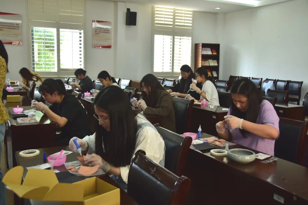 最后,在实操环节中,同学们纷纷化身为“文物修复体验官”。过水、拼接、涂胶水、贴胶带、调石膏、灌石膏在老师的悉心指导和同学们的大胆尝试下,陶碗的修复工作井然有序地进行着,很快一个个完整的陶碗就映入了眼帘。