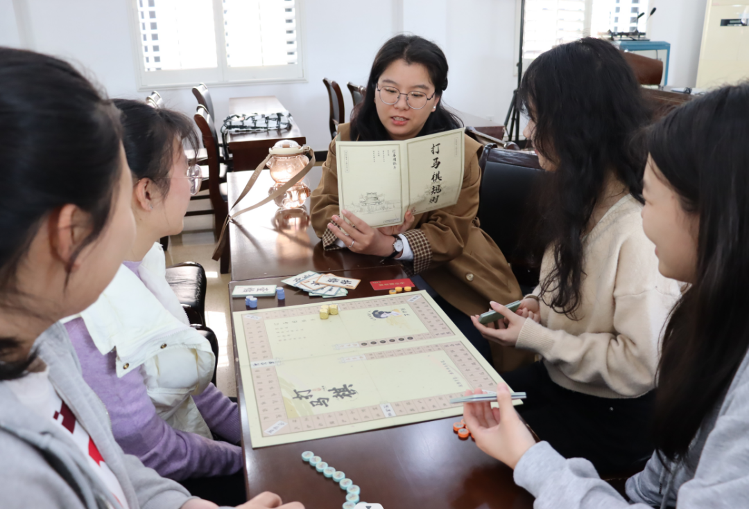 王浩茹老师首先对打马棋进行介绍,打马棋的发明者是李清照,其编写创作的《打马图经》、《打马赋》再对打马棋进行保护和传承。打马棋类似中国象棋的棋盘,不同的是在棋盘周围还布有方格,上面写着有“赤岸驿”、“函谷关”等名号,这些是游戏的关键所在,玩法与飞行棋和大富翁的类似。参与人数4-5人,“马”,每人10匹,也就是打马棋中使用的棋子,“打马”过程中,马的行走,用三颗骰子投掷出点数决定,而色样表规定了棋子按骰子的各种花样的走法,胜负则由玩家在这过程中的“票数”决定。