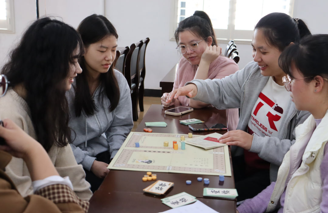 之后走过茶室,品过“错认水”,穿过酥饼和金华火腿店,观赏了金华绸缎后,来到了同学们最期待的部分——体验打马棋。