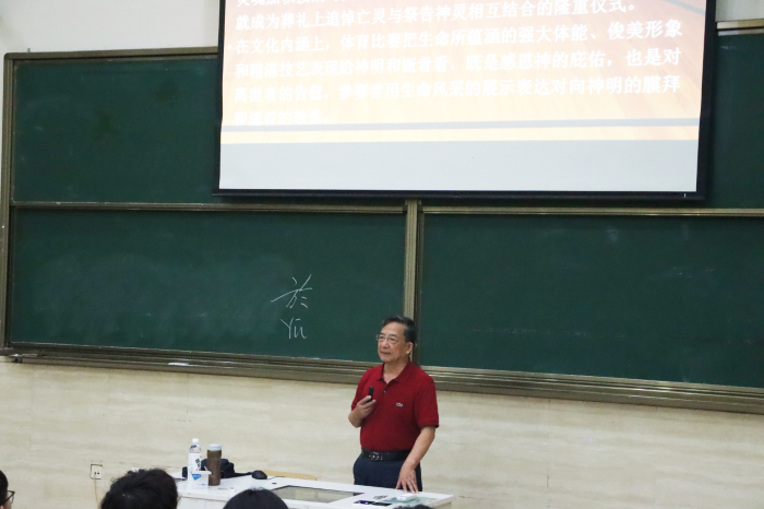 於教授以“朝阳绚丽亚西亚——奥运视域下的杭州亚运会”为切入点,生动讲述了亚运会的沿革及其文化内涵,指出要学习运动员的勇气和魄力,积极培养自身的拼搏精神,在关键时刻以智力、毅力和魄力为社会和国家贡献青春的力量。於教授以“潮平两岸阔,风正一帆悬”这一诗句表达他对体育精神和体育文化的深刻理解,又从杭州的历史文化底蕴、杭州亚运会文创特点等角度分析了“亚运文化”,并以体育精神和体育之美为视角谈竞技体育比赛的观赏与启迪。