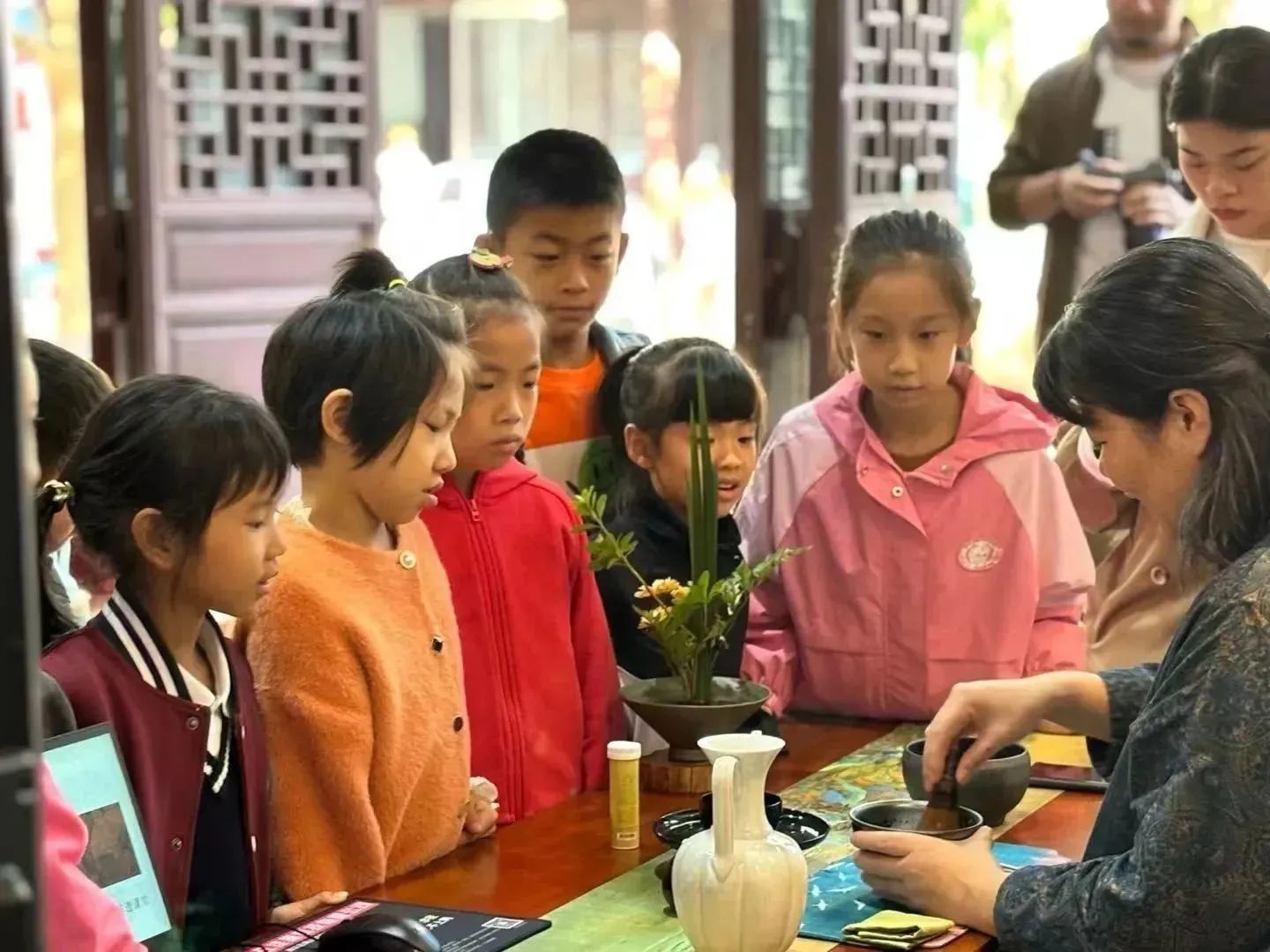 活动过程中,家长和小朋友们一同打出属于自己的茶沫,通过一次点茶体验,与千年前的古人进行了一场精神交流。还有些同学负责基地门口签到任务,细心地与每一位家长沟通交流,引导每一位小朋友有序进场,他们温和的态度和满脸的笑容获得了家长们的一致称赞。