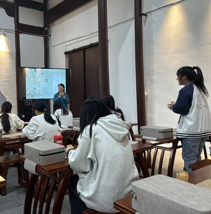 接着,郑老师就进入了今天课程的主题——点茶文化。她提到了兰溪的早茶,金华的茉莉花茶,宁波的望海茶等等,让同学们从中了解到原来一只小小的茶叶背后还蕴含着浓厚的历史韵味。