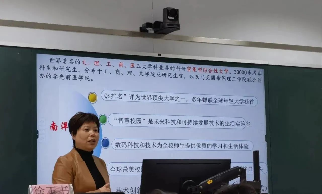 其次,徐玉书老师对于新加坡南洋理工大学进行介绍,讲述了学校的QS排名,相关设施等。也提到了新加坡技术创新和国际人才双向赋能可持续的发展的模式,同时讲到了新加坡的华裔馆,让同学了解到华裔馆的相关功能,对新加坡有进一步的了解。