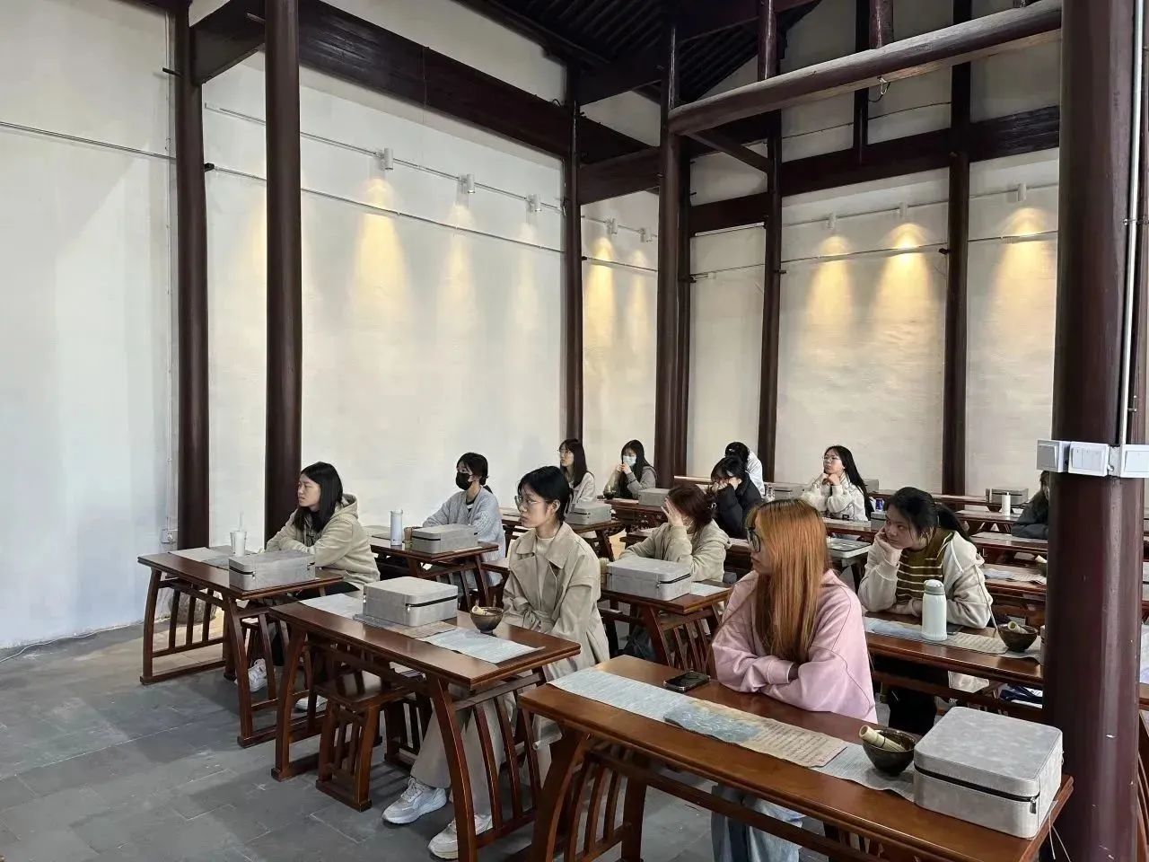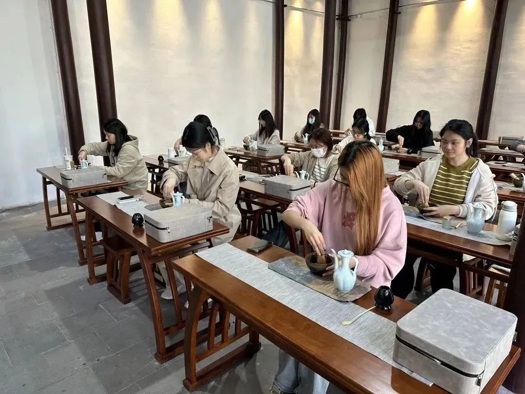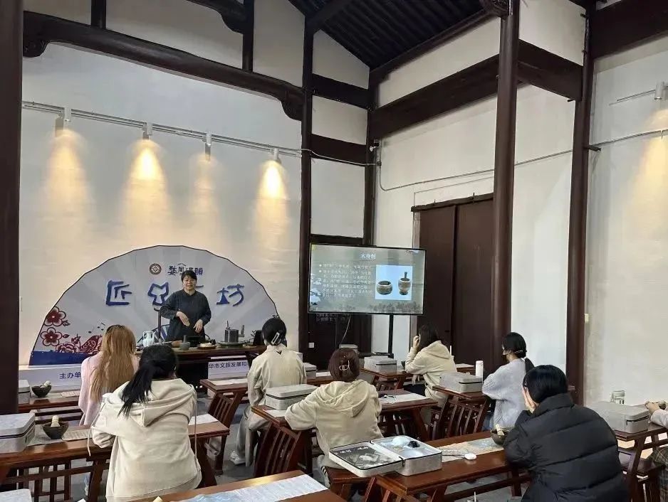 11月23日,由上海财经大学浙江学院婺文化译播研究中心和金华市非遗保护和信息中心合办的校馆课程“婺州举岩茶宋代点茶技艺”第四次课程在金华市非遗中心匠心工坊举行。国家一级茶艺技师郑咏恩以“别具特色的茶具”为课题,介绍了宋代的茶器并带领同学们进行实操,亲身体验了点茶文化。