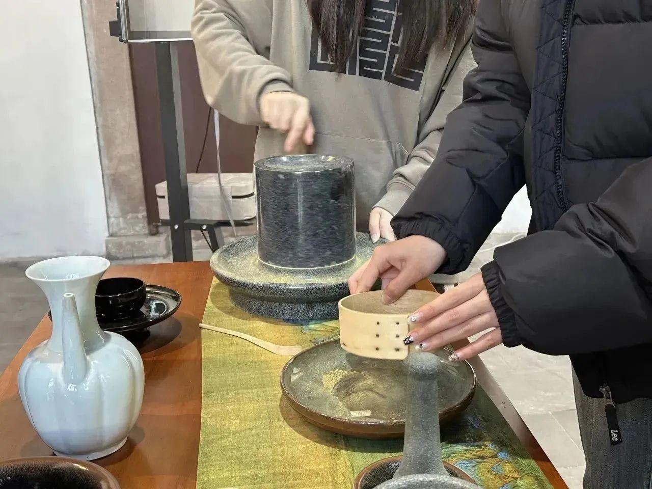 接着,郑老师带领同学们进入“实操之旅”。郑老师拿出茶粉,教我们如何用器具把茶粉碾得更碎。她把烧好的水倒入茶壶里,把碾碎的茶粉放入茶碗中,开始击拂这一步骤。郑老师教我们一边注水,一边用茶筅击拂茶汤直到茶汤出现稳定而持久的泡沫,待汤花呈现出美丽颜色后再将茶盏置于漆器或茶托之上。这个过程既耗时又耗力,极大地考验了我们的手腕功夫。同时,她再次强调了手腕的力道对于点茶制作的重要性。这一个看似简单的动作,却需要我们不断地练习,这样才有可能点茶成功。