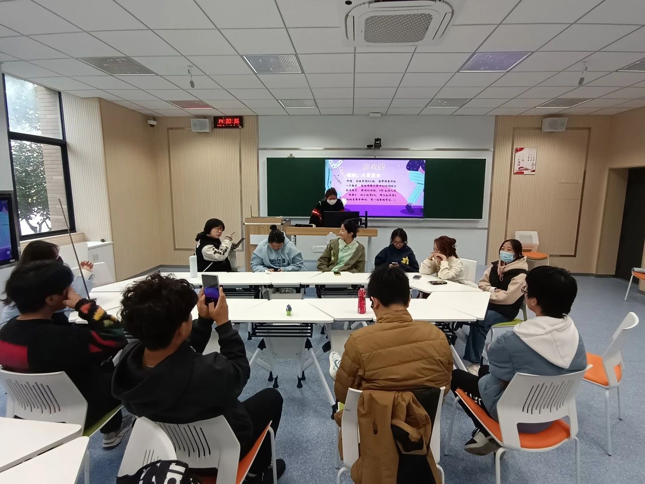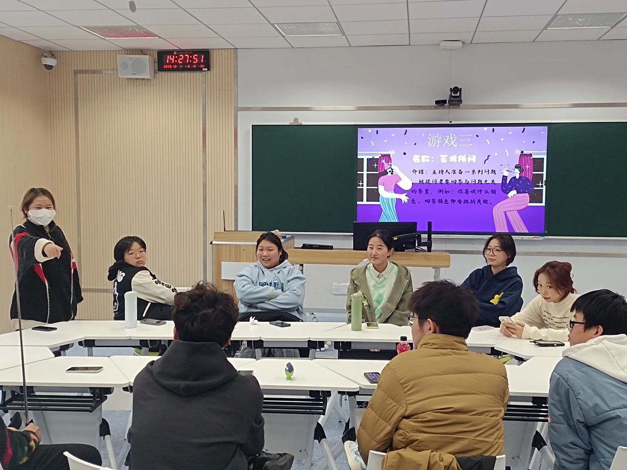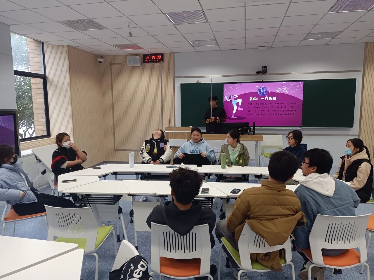 游戏刚开始时,大家都处于相对拘谨和腼腆的状态。在进行几轮游戏后,气氛逐渐轻松起来,同学们都全情投入到游戏中,共同体验反应力游戏所带来的紧张与刺激。每轮游戏结束后的惩罚环节中,同学们也因为小惩罚中的连环笑点而放声大笑,更是燃起了大家的热情与期待。