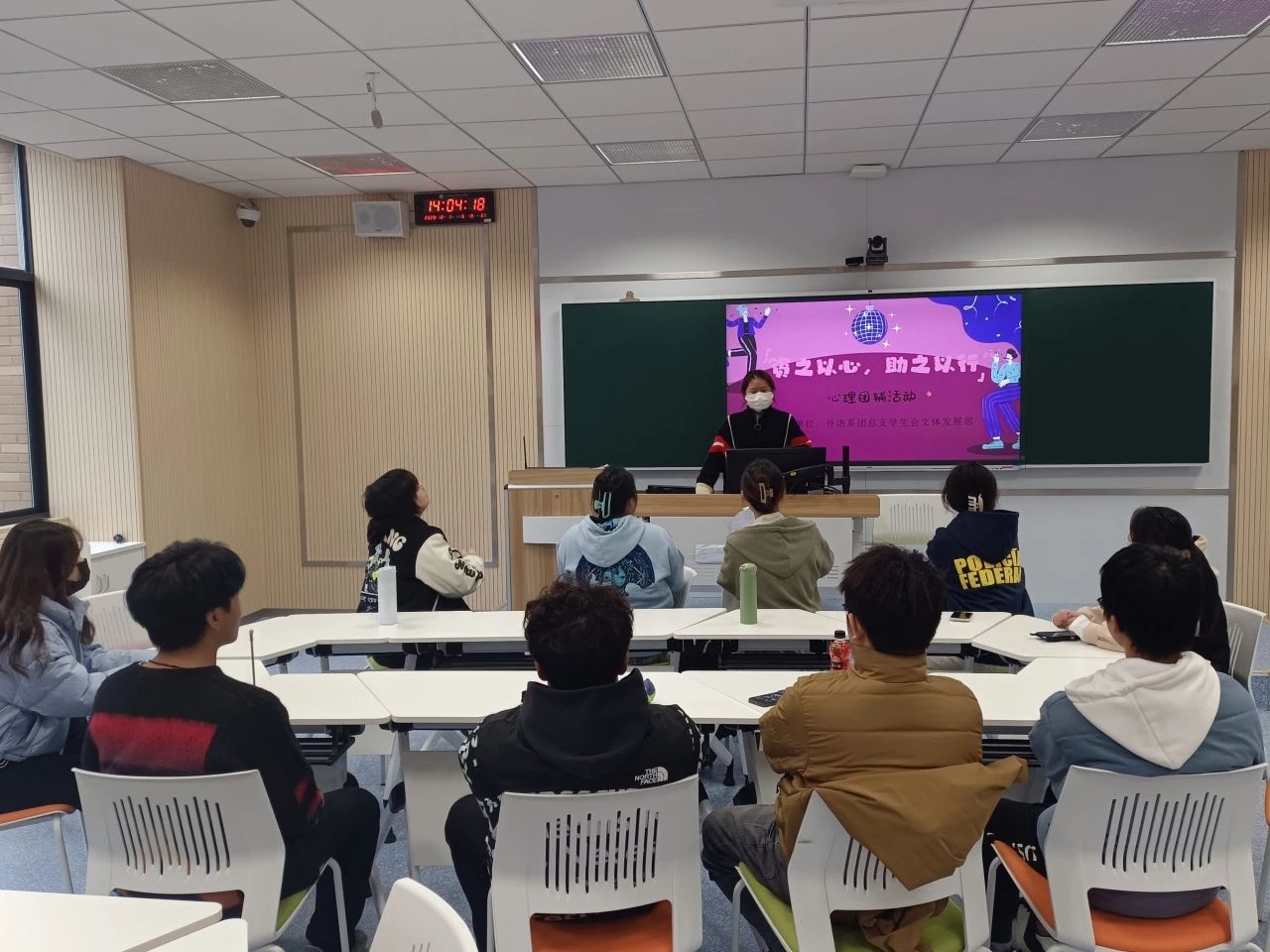 为帮助同学们更好的适应大学生活并融入集体,保持身心健康,我系文体发展部于12月2日下午14点在六幢教学楼106教室举办了“资之以心,助之以行”心理团辅活动,想以一同参与集体游戏作为纽带,让同学们在此活动中相互认识,提升自我。