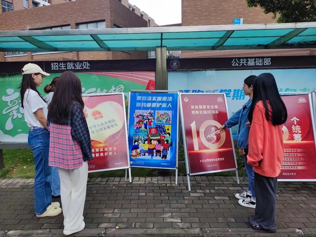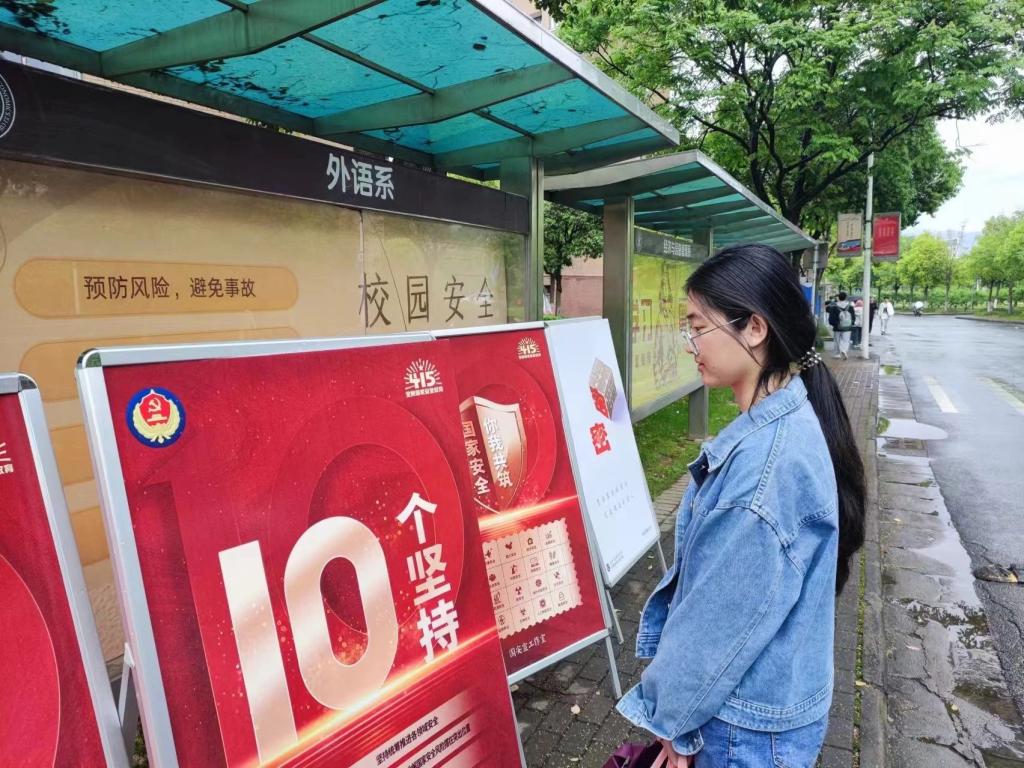 展板上,“总体国家安全观 创新引领10周年”十四个大字鲜红夺目,吸引过往学生驻足观看。展览以图文并茂的形式,生动展示了国家安全的重要性,引导师生树立正确的国家安全观念,内容既专业又通俗易懂。