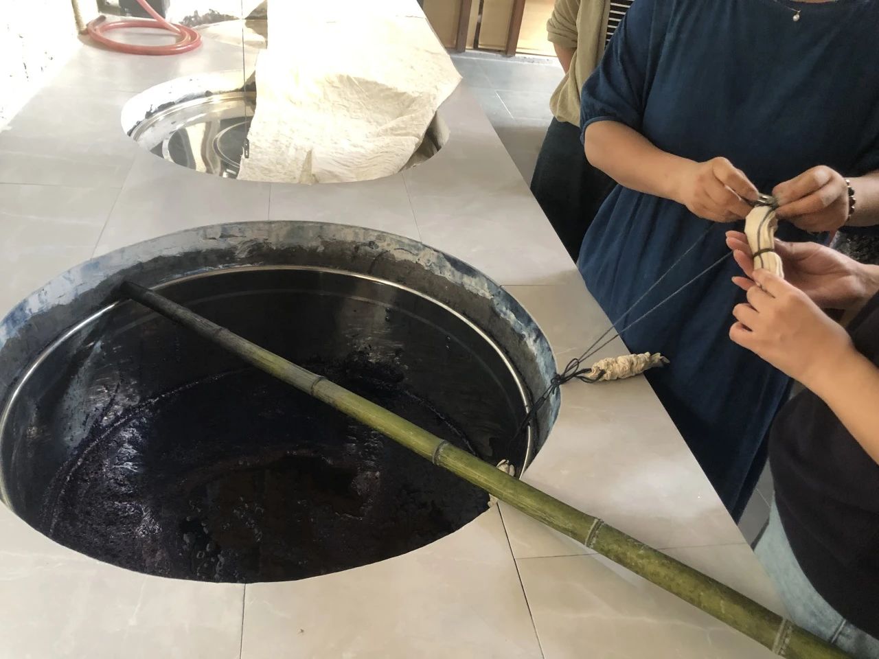 走进岩头村的婺州染坊,仿佛穿越回那个蓝白交织的古老时代。温国香站在染缸旁,一边介绍着各种植物染料的颜色和功效,一边指导学员们通过“扎” 、“染”、“漂”、“晒”等方式,将一块块白布变成色彩斑斓的艺术品。她解释说,婺州扎染采用纯植物板蓝根、茜草、五倍子等根茎叶提取的色素制成染料,这些天然染料不仅色泽自然环保,还具有一定的药用价值。正如《荀子·劝学篇》中所言,“青,取之于蓝,而青于蓝”,这种古老的染色工艺正是从蓝草中提取靛蓝,成就了青出于蓝而胜于蓝的美丽传说。