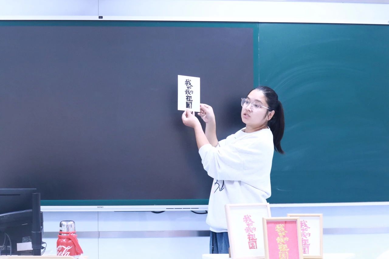 活动伊始,骆明月老师为大家详细介绍了制作的流程。同学们需先从准备就绪的材料包中取出染色竹条及印有“我和我的祖国”字样的纸板。在确保竹条与卡纸对齐且无缝隙后,使用胶水将竹条仔细贴合于字体的镂空部分。待胶水完全干燥,用剪刀剪去多余竹面,随后对表面进行清洁处理,最后将作品装入事先备好的相框。
