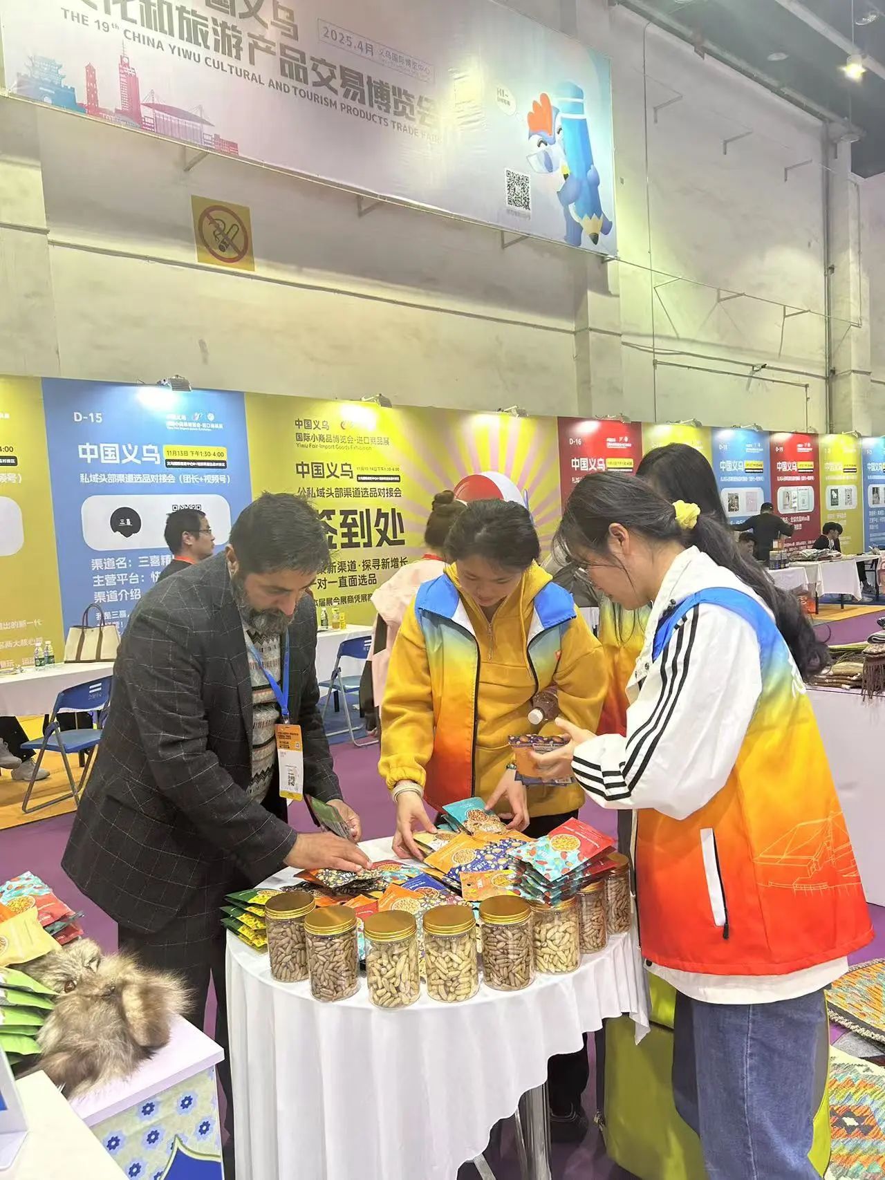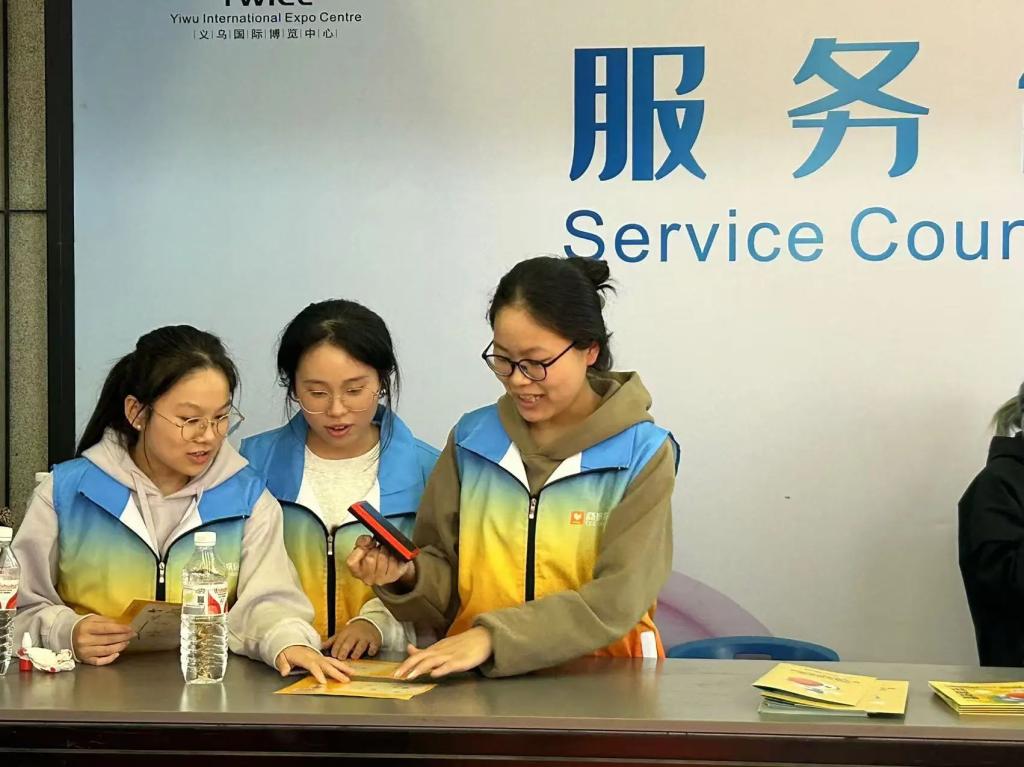 义博会第一天,在谢文老师的带领下,志愿者们迅速进入工作状态。他们有条不紊,或在定点协助外商翻译、售卖货物,或在服务点打卡、出补货单,帮助客商解决所遇的问题。他们微笑着用流利的外语询问需求,无论是指引道路、介绍参展商,还是协助解决突发问题,展现出扎实的专业素养。每一个微笑、每一句问候都传递着热情与友好。在老师的鼓励和支持下,志愿者们克服了紧张和不安,用热情和奉献书写着属于他们的精彩篇章,成为义博会上一道独特的青春风景线,让国际交流在这里畅通无阻。