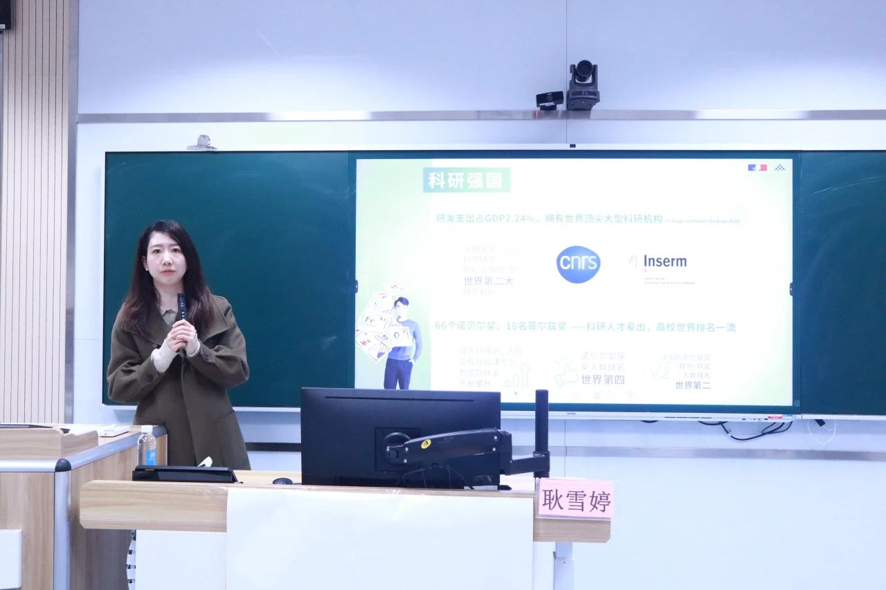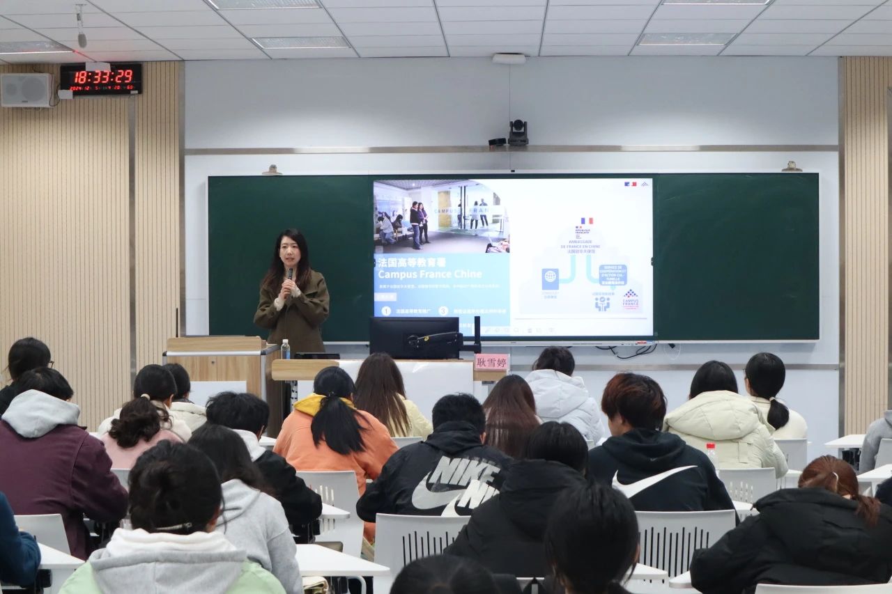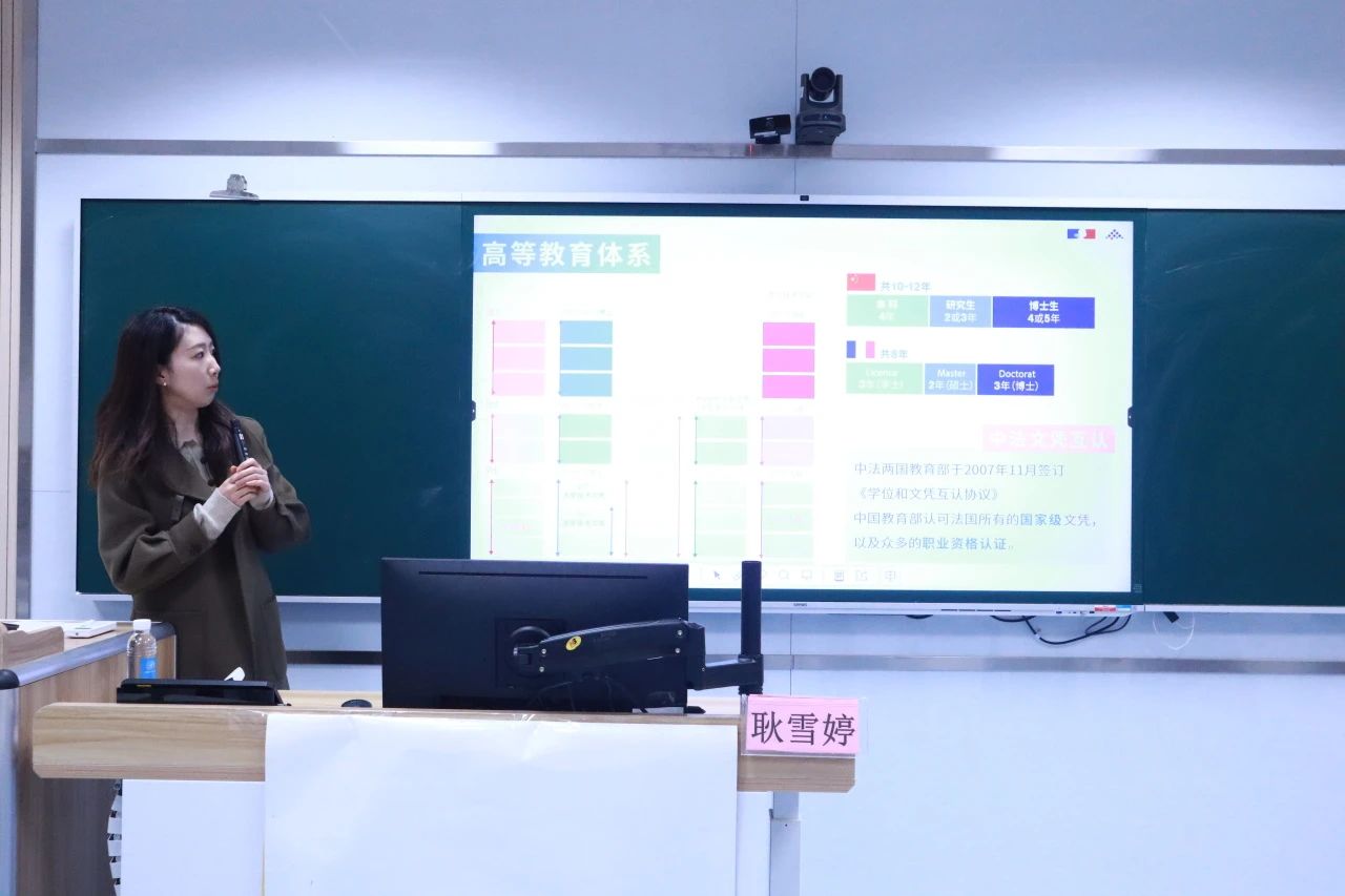 讲座伊始,耿雪婷老师播放了法国高等教育署的介绍视频,为同学们开启了了解法国高等教育的大门。通过视频,同学们初步了解了法国高等教育署的基本情况,以及赴法留学相关专业等信息。耿老师进一步介绍了法国高等教育署的主要职能,包括推广法国高等教育、组织法语考试、办理预签证程序办理和材料审核、留法校友会这四个重要方面。她强调,出国留学对于学生学习先进知识、拓展国际视野、提升职业前景有着重要意义。