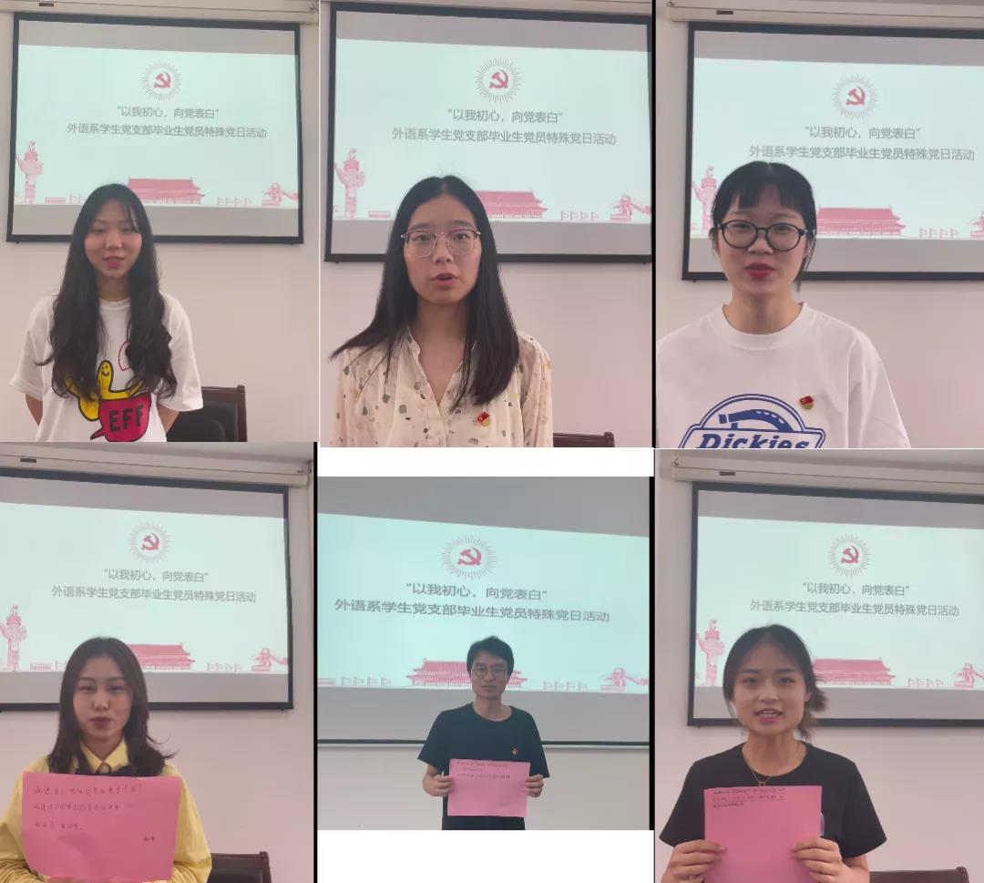 为引导毕业生党员站好最后一班岗,在今后的工作中立足实际,充分发挥先锋模范作用,外语系学生党支部于6月8日下午在28幢党员之家开展以“初心如磐,逐梦前行”为主题的特殊党日活动,通过毕业生党员分享一次学习成长与求职应聘经验、签署一份毕业生党员公开承诺书、“以我初心,向党表白”等活动,对所有学生党员进行一次全方位的教育。