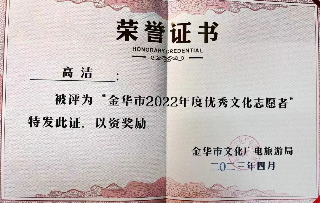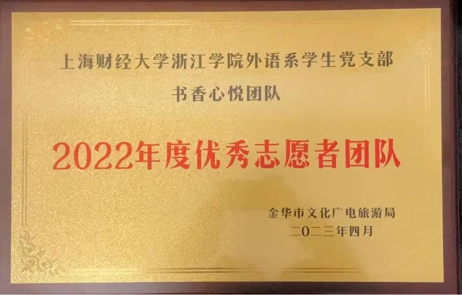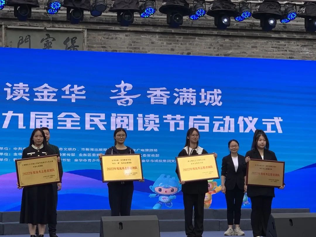 恰逢金华市第九届全民阅读节,我院外语系学生党支部书香心悦团队荣获金华市文化广电旅游局“2022年度优秀志愿者团队”,指导老师孔斐然、团队负责人高洁分别荣获“金华市2022年度优秀文化志愿者”荣誉称号。