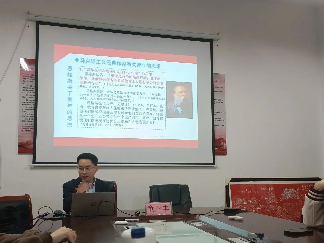 首先,通过学习马克思主义经典作家关于青年的思想,童教授强调青年一代要重视党史学习,从党史中汲取营养,要坚持理论与实践相结合。同时强调青年学生还要明确自我定位,认真进行职业生涯规划,学会自问自答“我是谁”。童教授也鼓励同学们要发挥专业优势,翻译马克思主义经典语句,开展党支部特色活动。