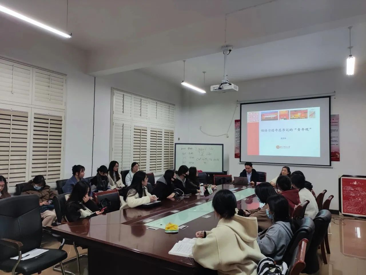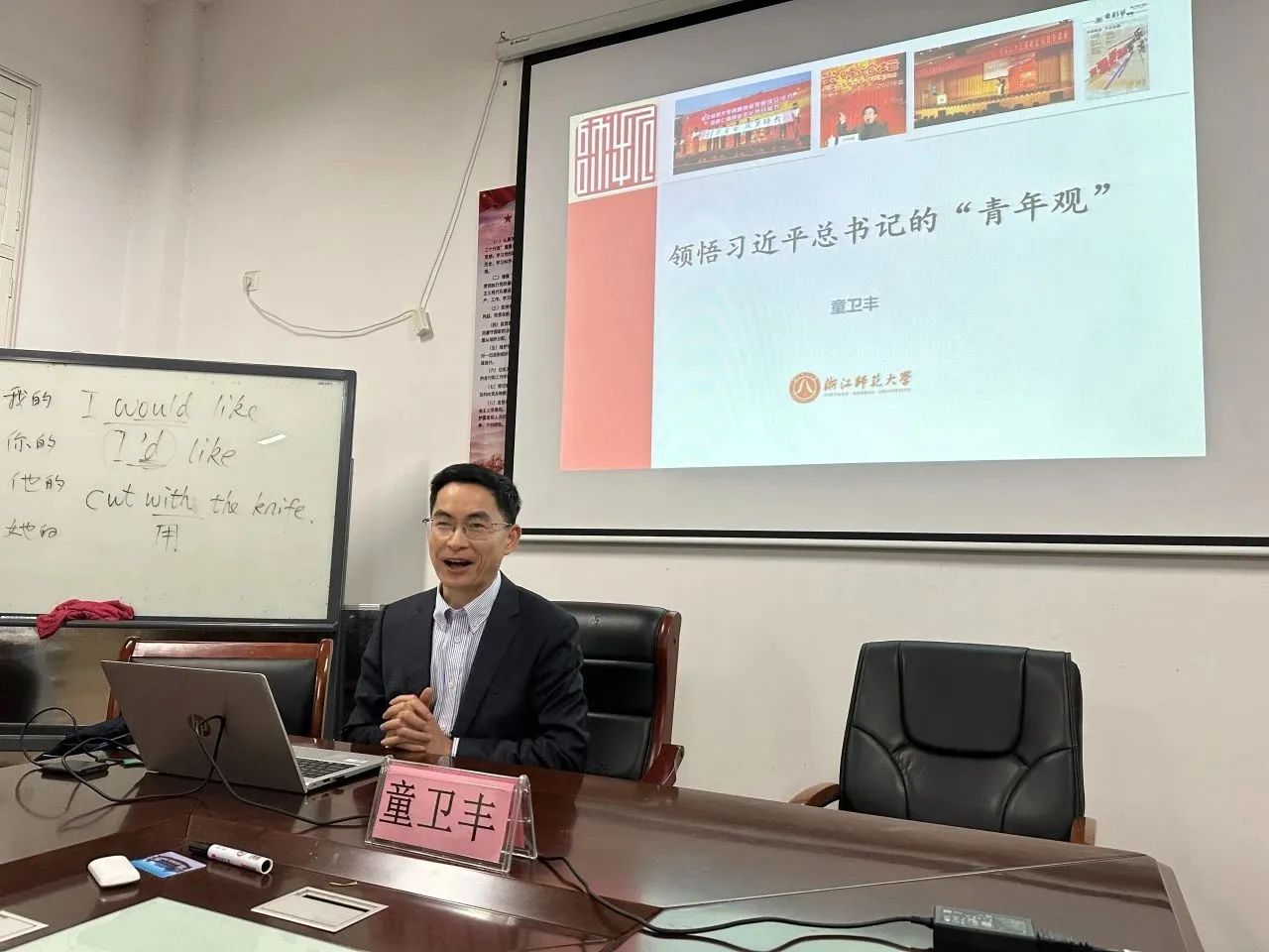 12月11日晚上,29幢217外语系会议室,为深入开展面向广大团员和青年的主题教育,加强青年学生理论学习,外语系邀请了浙江师范大学工学院党委书记、副院长童卫丰教授开展《领悟习近平总书记的“青年观”》讲座。21级全体学生党员和入党积极分子参加本次活动。
