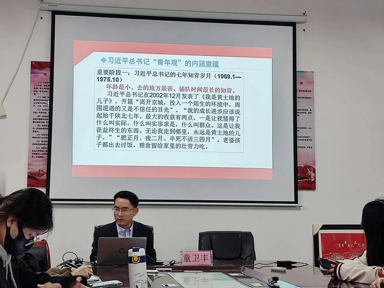 为理清历史逻辑、更好地体会“青年观”,童教授带领我们学习了“青年观”发展历程,解读了蕴含在习近平总书记“青年观”的内涵。又结合自己学生时代的社会实践经历,生动讲述了青年学生要如何树立劳动观和艰苦奋斗的心态。