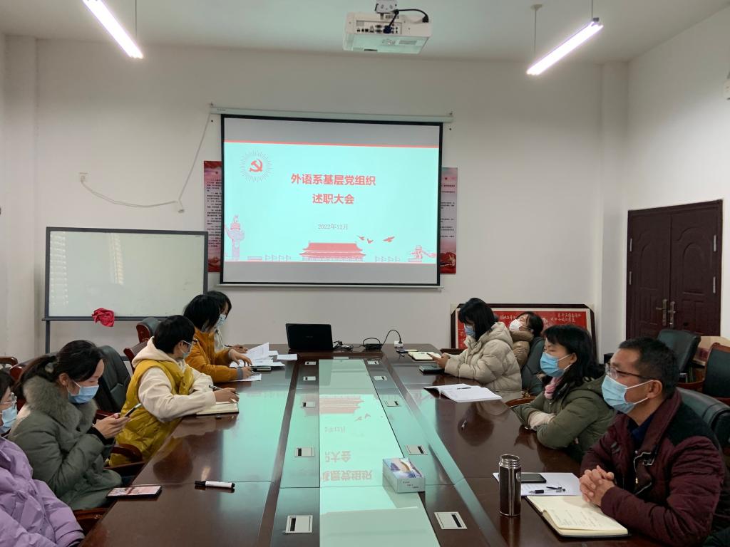 12月12日下午,外语系党总支召开基层党组织述职大会。会议由党总支副书记王明照同志主持,外语系教工党支部全体教师党员以及学生党支部学生党员代表参加了会议。