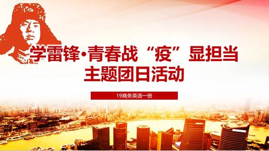 2020年3月5日18时30分,学院党委委员、副院长曾惠成老师,团委尤磊老师,外语系副主任徐玉书老师,党总支副书记周利兵老师,学工办主任孔斐然老师,辅导员兼外语系团总支书记王嘉晶老师,班主任胡亦丹老师,19级商务英语一班全体同学在钉钉app上组织“学雷锋·青春战‘疫’显担当”线上主题团日教育活动。